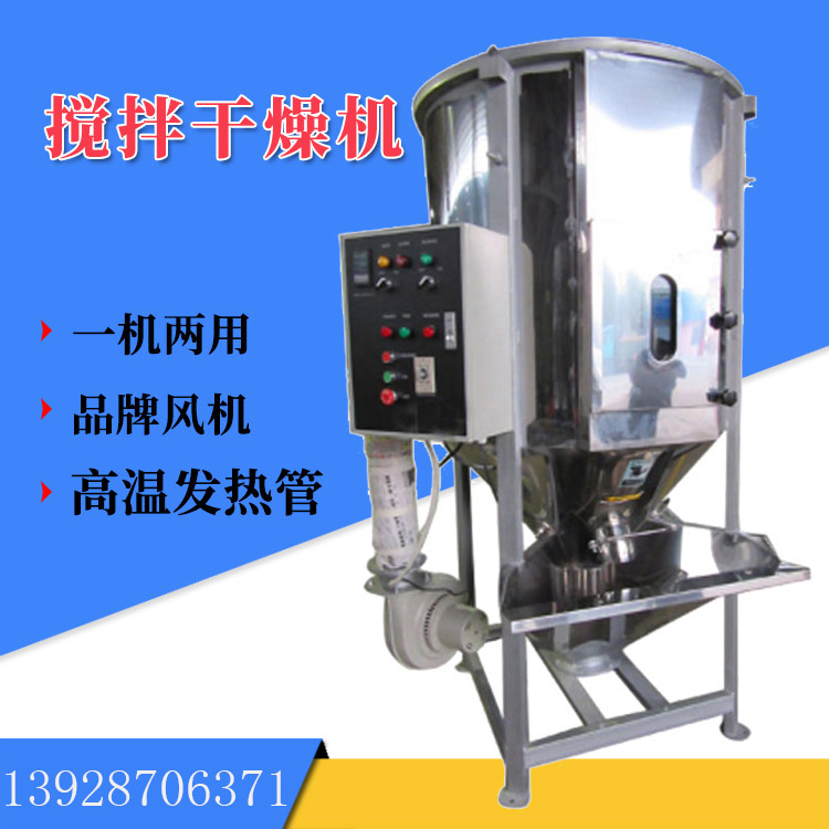 立式攪拌干燥機主要用于多種顏色塑料顆粒的混合,干燥機是注塑機、造粒機的必備配套設(shè)備之一,塑料粒子從進料斗進入,在螺旋葉片推進力的作用下,沿著葉片表面向上滑動前進在上部的離心力的作用下,向桶體四周散開,散開的物料不斷向下移動,由循環(huán)出料口和桶內(nèi)循環(huán)料口不斷被螺旋葉片帶動提升。這樣反復(fù)循環(huán),達到混合目的,與此同時空氣經(jīng)鼓風(fēng)機送至電加熱箱中,加熱后成為熱風(fēng)再 經(jīng)溫控表自動控制,以均勻適合的熱風(fēng)從樹脂之間一路穿透,穿過物料層,進行熱交替不斷帶走濕氣,樹脂粒子由上而下,下降過程中連續(xù)不斷得到吹掃干燥,完成高效率干燥和混合工藝。